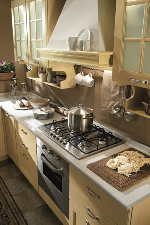 Una collezione classica caratterizzata da ante cieche, con telaio in massello di frassino e pannello interno impiallacciato, e ante intelaiate con cornici sagomate e vetro acidato bianco. Attenta e curata la selezione di colori a catalogo, che evidenzia le venature del legno, aumentando la percezione dei materiali, e valorizza le lavorazioni. Un modello nato per rappresentare il cuore della casa. Le maniglie anticate, i tavoli da lavoro, gli accessori per appendere le stoviglie, le cappe con cornici di finitura, le mensole, tutti richiami al passato, tutti riferimenti agli ambienti domestici legati alla memoria.